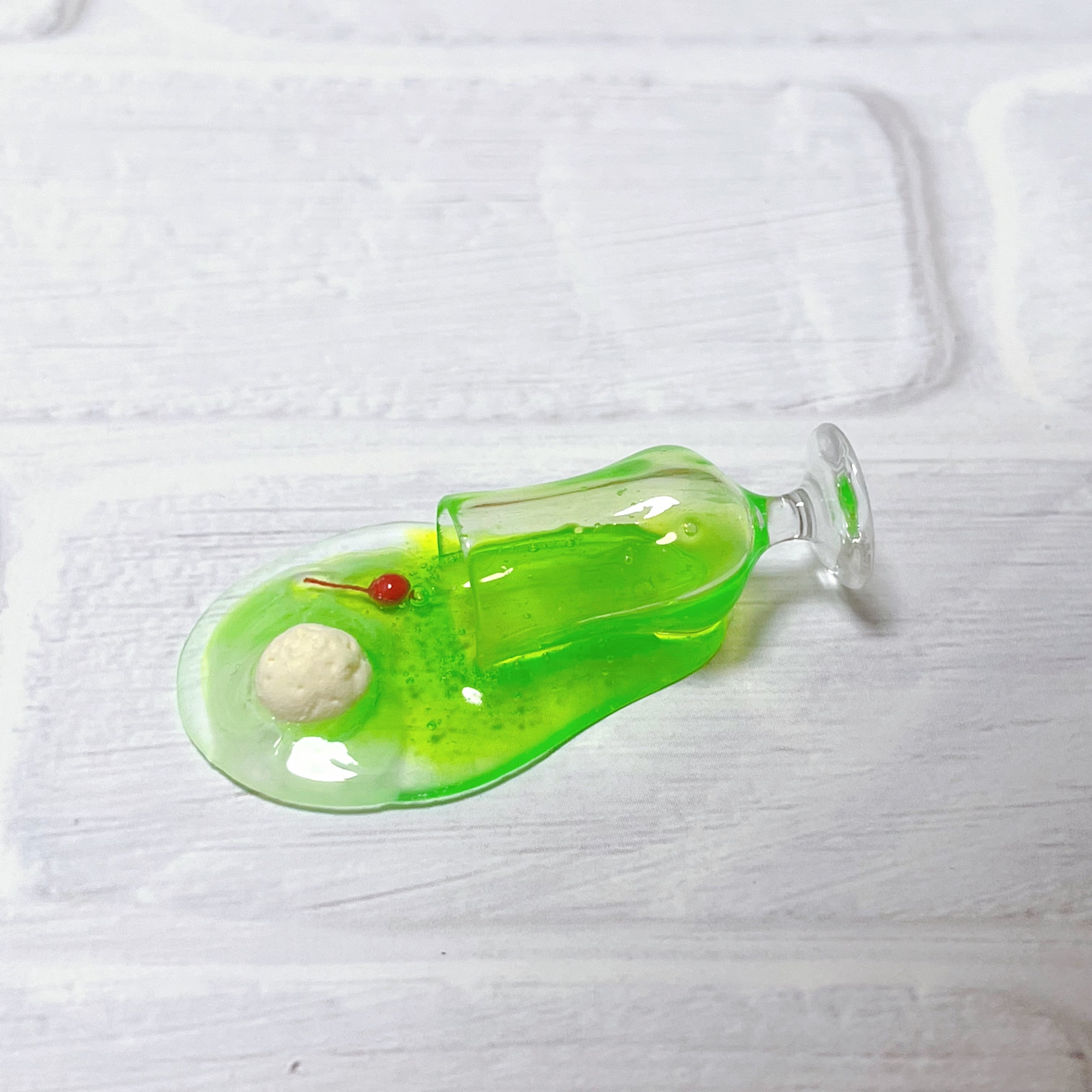シュワシュワの緑色が、テーブルの上を小川みたいに流れていきます。